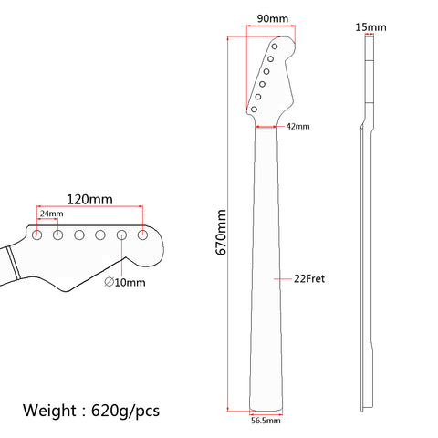 This 22 frets replacement maple neck fingerboard is made of qualified maple. The fingerboard is fitted with obvious dots which can be used as position markers. Adjustable truss rod has been installed at the headstock. Besides, 10mm head machine peg holes are designed for tuner installation. Suitable for ST type guitar.